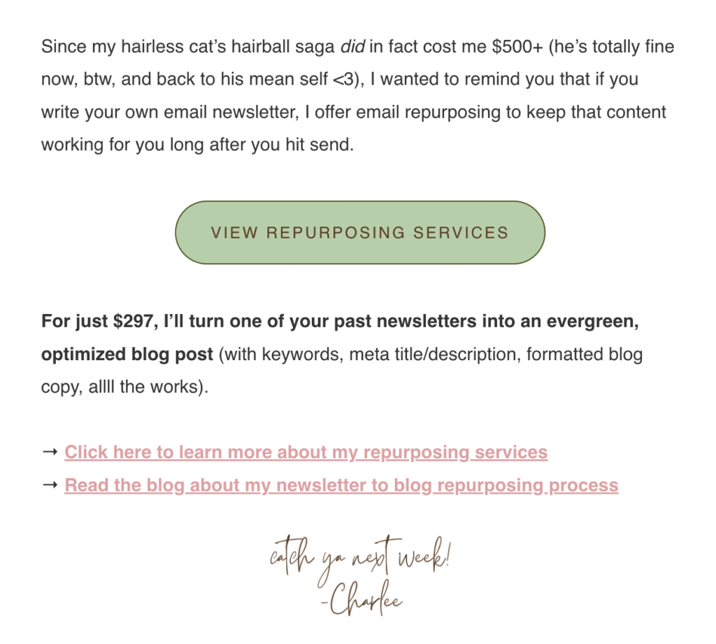 If you want help turning your newsletter emails into actual SEO-friendly blog posts that can bring in new readers beyond your inbox? That’s what I do!